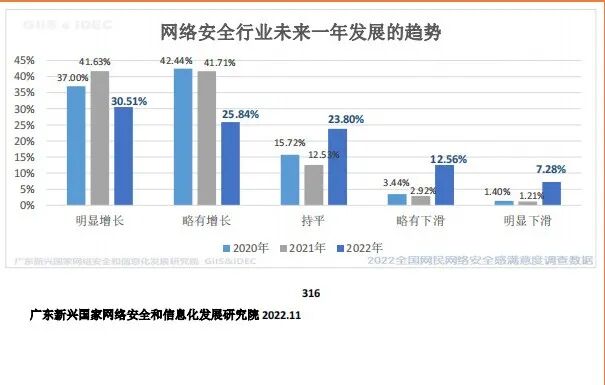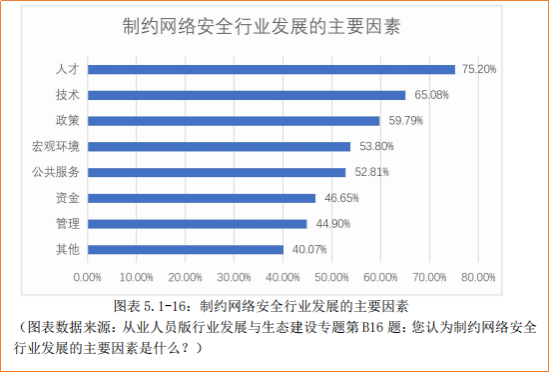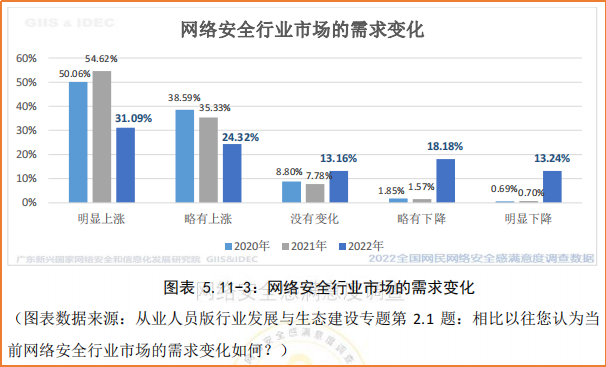 数据显示,从业人员对当前网络安全行业市场的需求变化评价和2021年相比,正面评价下降了34.54 个百分点,负面评价上升了30.55 个百分点,向负面评价转移。表示2022年网络安全行业市场需求有所回落,行业发展受到一定制约。