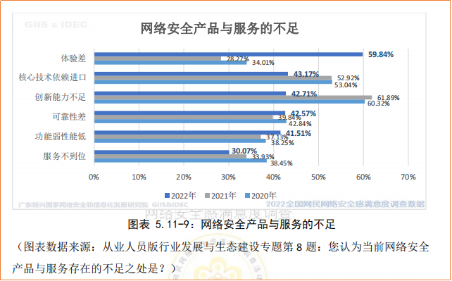 参与调查的从业人员对当前网络安全产品与服务存在问题看法为:排前5位的为: 第一位是“体验差”(选择率 59.84%),第二位是“核心技术依赖进口”(43.17%)、 第三位是“创新能力不足”(42.71%)、第四位是“可靠性差”(42.57%),第五位是 “功能弱性能低”(41.51%)。和2021年相比,选择率大幅上升的是“体验差”,选择率下降比较大的有“核心技术依赖进口”和“创新能力不足”,显示从业人员的关注点转向产品使用体验方面。