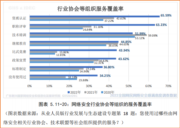 与此同时,调查发现,2022年网络安全行业协会等社会组织服务覆盖面扩大。服务的渗透率第一位是资质认证(覆盖率 65.59%),后面是职称评审(63.23%)、技术培训(51.99%)、继续教育(44.85%)、比武竞赛(43.94%)、政策宣贯(43.62%)、标准制定(36.80%)。和2021年相比,资质认证、职称评审、比武竞赛、政策宣贯、标准制定等服务项目的覆盖率都有所上升,升幅较大的有资质认证、职称评审和比武竞赛等服务。数据显示过去一年行业协会等社会组织提供的服务的覆盖面有了很大提升,但仍有三分之一的没有享用过服务,增长空间还比较大。